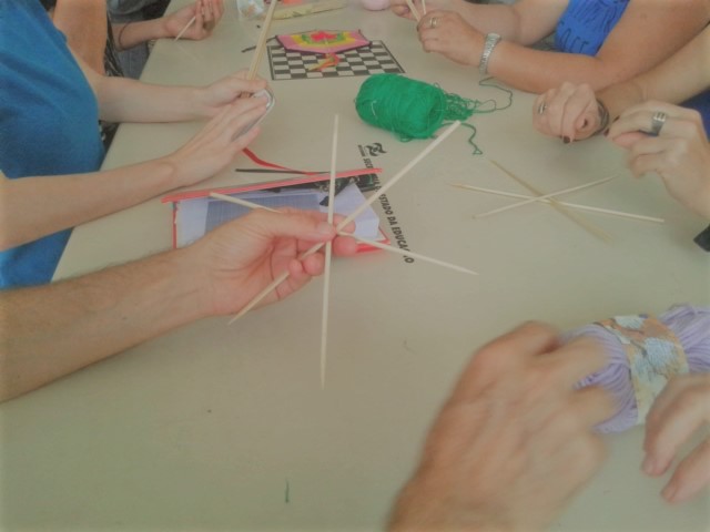 A oficina foi dividia em dois momentos: o primeiro a partir da construção da boneca Abayomi e da mandala Olho de Deus, demonstrou a importância da manipulação de materiais simples para a criação e expressão artísticas, bem como o desenvolvimento da coordenação motora fina. A segunda parte da oficina buscou o resgate de brincadeiras cantadas e dançadas que fazem parte da
